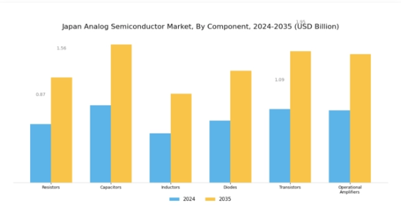日本アナログ半導体市場の構成要素セグメントには、抵抗器、コンデンサ、インダクタ、ダイオード、トランジスタ、オペアンプなど、数多くの電子アプリケーションにおいて重要な役割を果たす要素が含まれます。