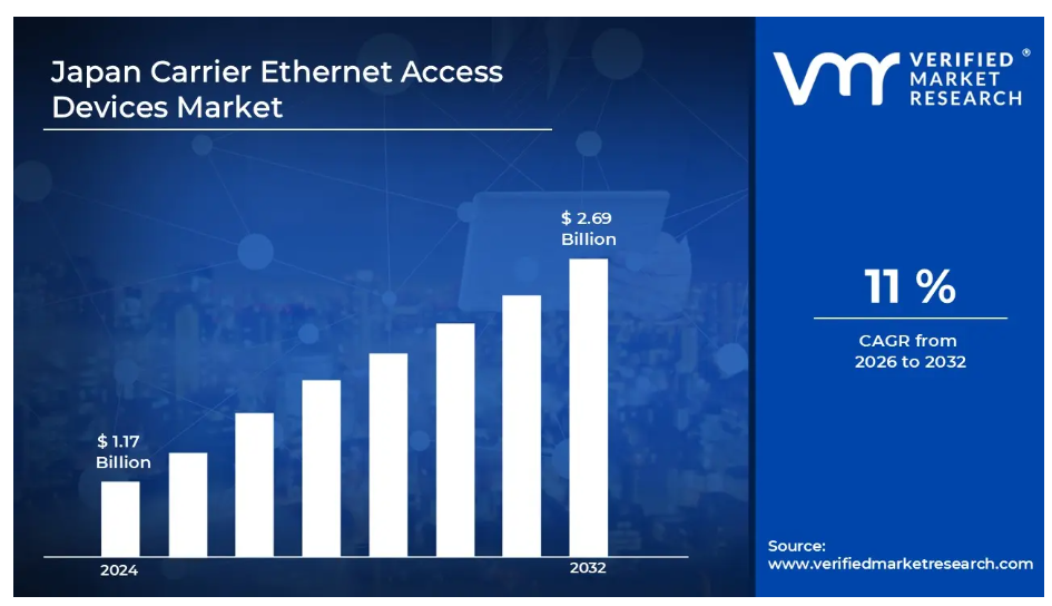 日本のキャリアイーサネットアクセスデバイス市場規模は、2024年に11億7,000万米ドルと評価され、予測期間(2026年~2032年)において年平均成長率(CAGR)11%で成長し、2032年までに26億9,000万米ドルに達すると見込まれております。