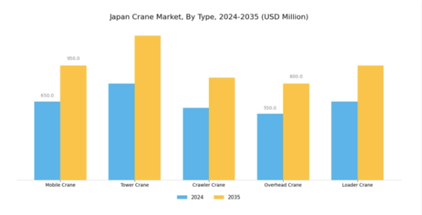 建設プロセスへの先進技術の導入がクレーン市場を変革しています。自動化、テレマティクス、スマートクレーンといった革新技術が日本の建設業界で急速に普及しつつあります。これらの技術は作業効率、安全性、生産性を向上させ、現代的なクレーンを建設会社にとってより魅力的な存在としています。企業がこうした進歩の導入を目指す中、技術的に高度なクレーンへの需要は増加すると予想されます。スマートクレーン市場は年間15%の成長が見込まれており、産業がより洗練された設備へと移行していることを反映しています。企業が最先端のソリューションに投資するにつれ、この傾向がクレーン市場の成長を牽引する可能性が高いです。