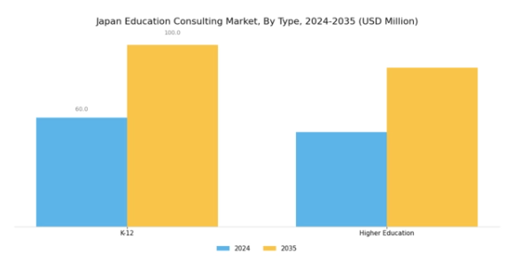 日本教育コンサルティング市場は、多様なタイプセグメントが特徴であり、特にK-12(初等中等教育)と高等教育といった様々なカテゴリーで構成されています。それぞれが日本の教育環境形成において重要な役割を担っています。K-12セグメントは初等・中等教育に焦点を当て、生徒の早期の学術育成において極めて重要です。このセグメントは、グローバル競争力の強化と若年学習者の創造性育成を目指す日本の教育改革と連動しており、より現代的なカリキュラムへの需要増大に対応する点で意義があります。