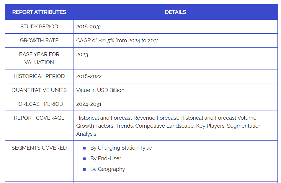 充電ステーションと太陽光発電などの再生可能エネルギー源の統合は、日本の持続可能性目標に沿うものであり、電力系統の効率化を促進します。さらに、日本におけるEV対応都市インフラの拡充や、電気タクシー、配送車両、バスの増加は、市場を2024年から2031年にかけて年平均成長率(CAGR)21.5%で成長させることで、遍在かつ戦略的に配置された充電ステーションの需要を牽引しております。
