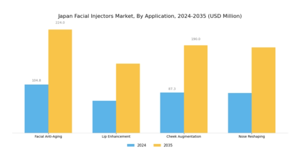 日本の顔面注入剤市場は、顔面アンチエイジング、唇のボリュームアップ、頬のボリュームアップ、鼻の再形成などの分野を含む用途セグメントにおいて著しい成長を示しています。顔面アンチエイジング治療の需要は、若々しい外見を維持するための非侵襲的ソリューションを求める方が多い、日本の急速な高齢化によって牽引されています。