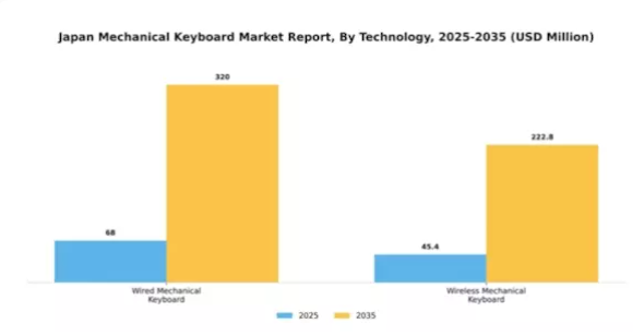 技術別:有線メカニカルキーボード(最大)対 無線メカニカルキーボード(急成長中)