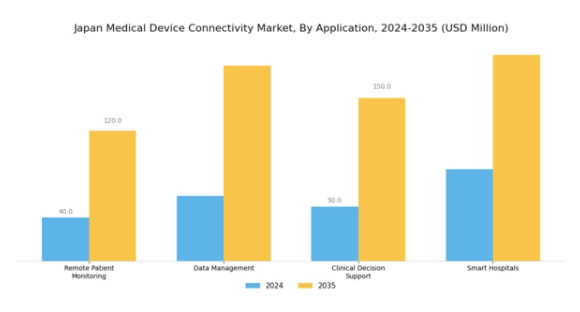 日本の医療機器接続市場におけるアプリケーション分野は急速に成長しています。このセグメントには、遠隔患者モニタリング、データ管理、臨床意思決定支援、スマート病院といった重要な分野が含まれます。この成長の主な要因は、医療成果の向上に対するニーズの高まり、慢性疾患患者の増加、医療資源の効率的な管理の必要性です。