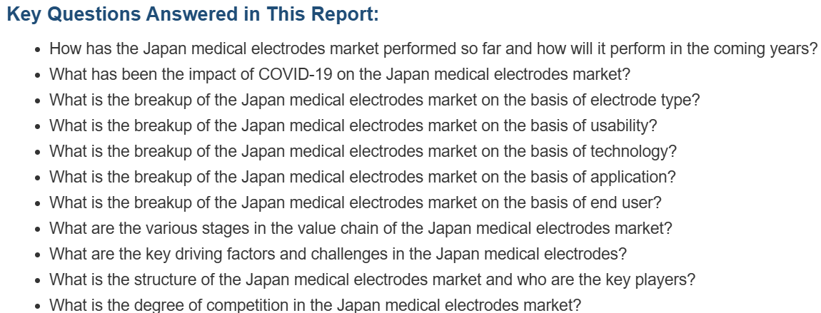 日本の医療用電極市場は、いくつかの主要な要因により、力強い成長を遂げています。まず、心臓血管障害や神経疾患などの慢性疾患の患者数の増加により、診断手順や患者の健康状態のモニタリングに重要な役割を果たす医療用電極の需要が高まっています。さらに、高齢化社会の進展により医療サービスのニーズが高まり、さまざまな医療現場で医療用電極の使用が増加しています。また、電極材料や設計の技術進歩により電極の性能が向上し、より効率的で使いやすくなっています。これにより医療提供者の採用がさらに進み、市場の成長がさらに加速しています。また、医療従事者と患者の両方において、早期診断と継続的なモニタリングのメリットに対する認識が高まっていることも、医療用電極の需要を促進しています。さらに、遠隔患者モニタリングソリューションの採用が拡大していることで、遠隔医療アプリケーション向けの医療用電極の使用が急増しています。その結果、日本における医療用電極市場は、これらの相互に関連する要因によって、今後数年間、継続的な拡大が見込まれています。