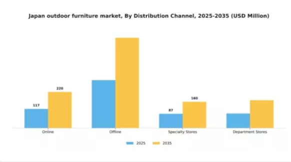 日本の屋外用家具市場において、流通チャネルは消費者の購買行動を形作る上でますます重要な役割を担っています。オンライン販売は最大のセグメントとして台頭し、eコマースプラットフォームの利便性とアクセシビリティにより、大きな市場シェアを獲得しています。しかし、オフライン販売、特に実店舗を通じた販売は、購入前に商品を実際に体験できる点で依然として重要な位置を占めています。専門店や百貨店も、独自のショッピング環境とパーソナライズされたサービスを提供することで、この市場構造に貢献しています。今後の展望として、流通チャネルセグメントの成長傾向は、技術の進歩と消費者の嗜好の変化に牽引され、オンラインショッピングへのダイナミックな移行を反映しています。デジタルマーケティング戦略の台頭とオンラインショッピング体験の向上により、オンラインチャネルは最も成長が速い分野となっています。一方、専門店や百貨店も、より魅力的な店内体験を取り入れるなど進化を続け、変化する市場環境において競争力を維持するため、提供内容のバランス調整を図っています。