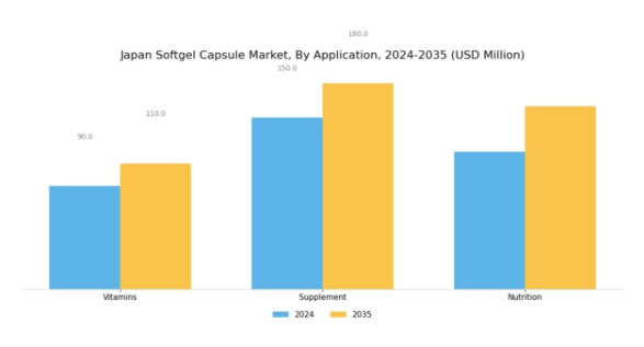 日本におけるソフトジェルカプセル市場の用途分野は、健康とウェルネスに対する消費者意識の高まりを主な要因として、著しい成長を見せております。ビタミンはこの分野で重要な役割を担っており、全身の健康維持に不可欠であることから、生体利用率を向上させるソフトジェル形態への安定した需要が生じております。サプリメントは、特に栄養摂取の向上を求める高齢化社会において、便利な食事ソリューションを提供するとして人気が高まっております。