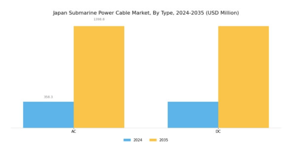 日本の海底電力ケーブル市場は、交流(AC)ケーブルと直流(DC)ケーブルの両方を含む多様な種類セグメンテーションを示しています。本市場は、再生可能エネルギー源への依存度増加と洋上風力産業の拡大を特徴とする日本の進化するエネルギー環境に伴い、大幅な成長が見込まれます。交流ケーブルは、風力発電所を接続し短距離での電力送電を可能とする有用性で広く認知されており、沿岸発電プロジェクトにおける優先選択肢となっています。