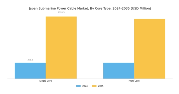 日本の海底電力ケーブル市場では、特に単芯ケーブルと多芯ケーブルのカテゴリーにおいて、コアの種類による明確な区分が見られます。単芯ケーブルは、単一の送電経路で十分な比較的単純な用途に頻繁に利用され、コスト効率に優れ、設置も容易です。