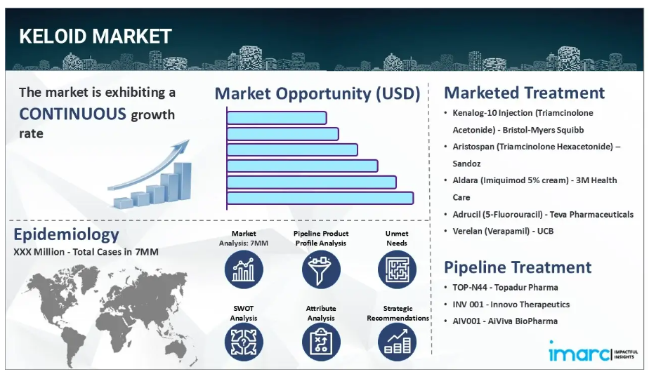 IMARC Groupの新たなレポートは、米国、EU4(ドイツ、スペイン、イタリア、フランス)、英国、日本におけるケロイド市場について包括的な分析を提供しています。これには、治療実践、市場流通中および開発中の薬剤、個別療法のシェア、7大市場における市場動向、主要企業とその薬剤の市場実績などが含まれます。本レポートではさらに、7大市場における現在および将来の患者層についても提示しています。レポートによれば、米国はケロイド患者数が最も多く、その治療市場も最大規模を占めています。さらに、現在の治療実践/アルゴリズム、市場推進要因、課題、機会、償還シナリオ、未充足医療ニーズなども本報告書に記載されております。本報告書は、製造業者、投資家、ビジネス戦略家、研究者、コンサルタント、およびケロイド市場に関与している、あるいは何らかの形で参入を計画している全ての方にとって必読の資料です。