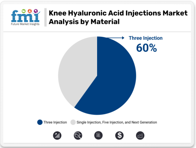 3回注射型膝用ヒアルロン酸注射剤セグメントは、2025年に60.0%の市場シェアで優位性を維持すると予測される。この成長過程は、膝変形性関節症患者に持続的な症状緩和を提供する治療法の利便性と有効性によって推進されている。