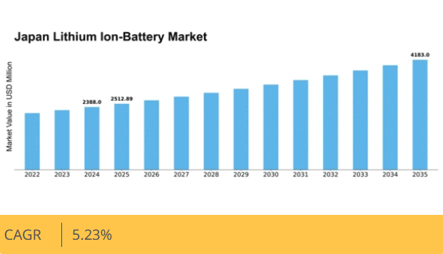日本のリチウムイオン電池市場は、技術進歩・電気自動車需要拡大・再生可能エネルギー統合を背景に、2025年から2035年にかけて年平均成長率5.23%で拡大すると予測される。