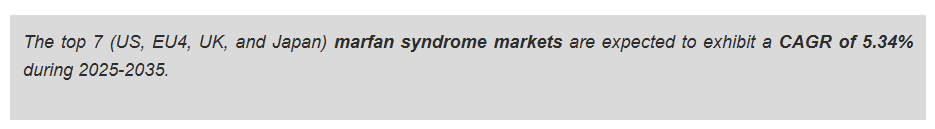 上位7市場(アメリカ、EU4、英国、日本)のマルファン症候群市場は、2025年から2035年にかけて年平均成長率(CAGR)5.34%で成長すると予測されております。