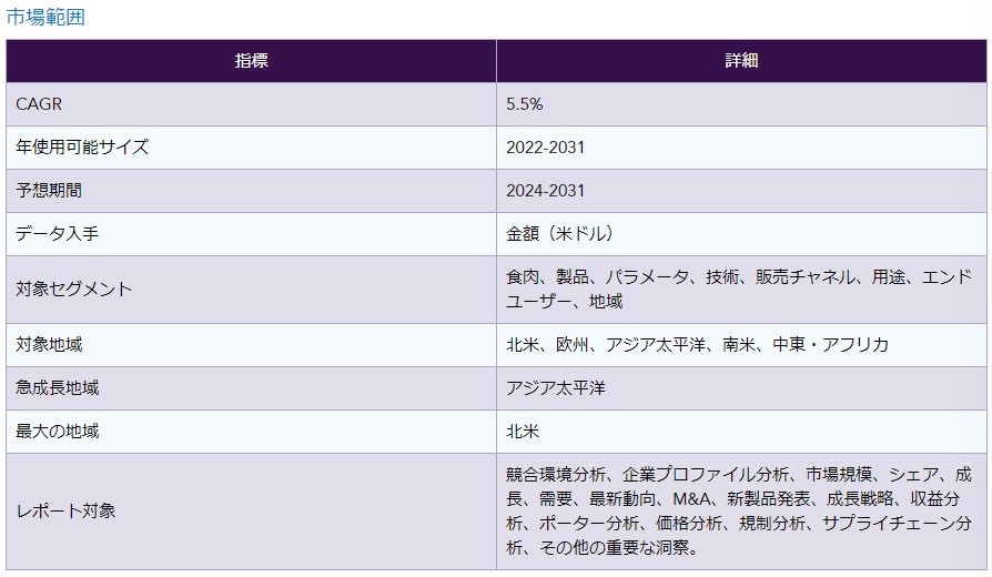 | この文章は、肉類市場に関する詳細な調査報告の概要を示しています。以下に主要なポイントを要約いたします。 まず、調査方法と調査範囲が説明されています。調査の目的は、肉類市場の現状や傾向を把握することです。調査方法には定性的および定量的な分析が含まれ、市場のダイナミクスを理解するために各種データが収集されています。 次に、肉類市場の定義と概要が述べられています。エグゼクティブサマリーでは、肉類の種類や製品別、パラメータ別、技術別、販売チャネル別、アプリケーション別、エンドユーザー別、地域別のスニペット情報が提供されています。 市場のダイナミクスについては、影響要因が分析されており、先端技術の利用やパック詰め肉製品の需要増加がドライバーとして挙げられています。一方で、高コストとメンテナンスが阻害要因として指摘されています。また、市場の機会や影響分析も行われています。 業界分析では、ポーターのファイブフォース分析やサプライチェーン分析、価格分析、規制分析が含まれています。特にCOVID-19の影響分析が行われ、パンデミック前、中、後のシナリオが設定されています。価格ダイナミクスや需給スペクトラム、政府の取り組み、メーカーの戦略的取り組みも記載されています。 肉類市場の各種分析が続き、牛肉、豚肉、家禽、羊肉などの市場規模や前年比成長率が示されています。各製品別、パラメータ別の詳細な分析が行われ、市場魅力度指数も提供されています。 さらに、販売チャネル別、アプリケーション別、エンドユーザー別、地域別の市場分析が行われており、各地域の特性や市場規模が詳しく説明されています。北米、ヨーロッパ、南米、アジア太平洋、中東およびアフリカ地域における市場動向が特に強調されています。 競争環境については、競争シナリオ、市場ポジショニング、シェア分析、M&A分析が行われています。最後に、主要企業の概要やサービス、財務状況、主要な開発についても触れられています。 付録として、会社概要やサービス情報、お問い合わせ情報が含まれています。この調査報告は、肉類市場に関心のある企業や研究者にとって非常に有益な資料となるでしょう。 |