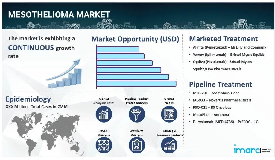IMARC Groupの新報告書は、米国、EU4(ドイツ、スペイン、イタリア、フランス)、英国、日本における中皮腫市場の詳細な分析を提供します。これには、治療実践、市場流通中および開発中の薬剤、個別療法のシェア、7大市場における市場動向、主要企業とその薬剤の市場実績などが含まれます。本レポートではさらに、7大市場における現在および将来の患者数についても提示しています。レポートによれば、米国は中皮腫患者数が最も多く、治療市場としても最大規模を占めています。さらに、現在の治療実践/アルゴリズム、市場推進要因、課題、機会、償還シナリオ、未充足医療ニーズなども本報告書で提供されています。本報告書は、メーカー、投資家、ビジネス戦略家、研究者、コンサルタント、および中皮腫市場に関与している、あるいは何らかの形で参入を計画している全ての方にとって必読の資料です。