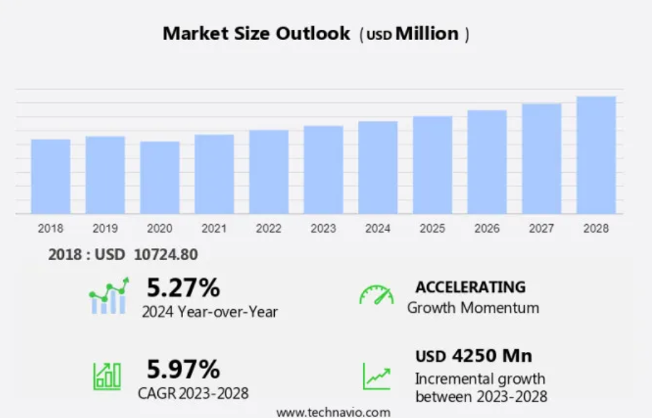 加工でんぷん市場規模は、2023年から2028年の間にCAGR 5.97%で42.5億米ドル増加すると予測されています。市場拡大の鍵となる要因には、増粘剤の需要の高まり、コスト効率の高い代替品としてのコーンスターチの人気上昇、加工でんぷんに焦点を当てた研究開発努力の活発化などがあります。増粘剤に対する需要は、さまざまな業界で広く使用されていることを裏付け、市場の成長を促進しています。 特にコスト重視の市場では、他の代替品と比較して手頃な価格であるコーンスターチに対する需要が堅調です。 同時に、加工でんぷんの機能性を高めることを目的とした研究開発活動の増加は、進化する消費者ニーズと業界の要件に対応しています。これらの要因が相まって市場のダイナミクスを推進し、でんぷん業界におけるイノベーションを促進し、製品ラインナップの拡大につながっています。消費者の嗜好や産業用途が進化するにつれ、市場も進化し続け、多様な市場の需要に応える適応力とイノベーションの重要性が強調されています。