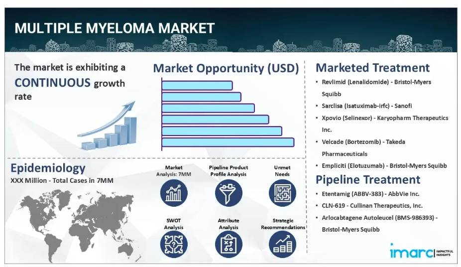 IMARC Groupの新報告書は、米国、EU4(ドイツ、スペイン、イタリア、フランス)、英国、日本における多発性骨髄腫市場について包括的な分析を提供します。これには、治療実践、市場流通薬および開発中の薬剤、個別療法のシェア、7大市場における市場動向、主要企業とその薬剤の市場実績などが含まれます。本報告書ではさらに、7大市場における現在および将来の患者数についても提示しております。報告書によれば、米国は多発性骨髄腫の患者数が最も多く、治療市場としても最大規模を占めております。さらに、現在の治療実践/アルゴリズム、市場推進要因、課題、機会、償還シナリオ、未充足医療ニーズなども本報告書で提供されています。本報告書は、製造業者、投資家、ビジネス戦略家、研究者、コンサルタント、および多発性骨髄腫市場に関与している、あるいは参入を計画している全ての方にとって必読の資料です。