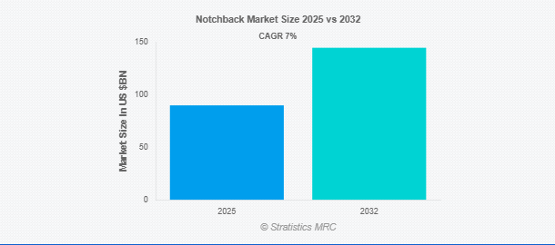 Stratistics MRCによると、ノッチバックの世界市場は2025年に898億ドルを占め、予測期間中の年平均成長率は7.0%で、2032年には1,446億ドルに達する見込みです。ノッチバックは、エンジン、乗員、荷室を明確に分離した3ボックスデザインを特徴とする自動車のボディスタイルです。ルーフからリアまで連続した傾斜を持つファストバックとは異なり、ノッチバックはルーフとトランクの間に明確な「切り欠き」や段差があるのが特徴です。セダンによく見られるノッチバックは、伝統的でフォーマルな外観を提供します。ハッチバックではなく、独立した密閉式のトランクを持つのが一般的です。ノッチバックは、その古典的な美しさと明確なコンパートメントが評価され、より伝統的で構造的な車両デザインを好む人々の間で人気があります。
