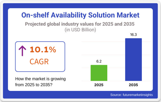 世界のオンシェルフ・アベイラビリティ・ソリューション市場:世界のオンシェルフ・アベイラビリティ・ソリューション市場は、2025年に62億米ドルと評価、2035年までに163億米ドルに達する予測、年平均成長率(CAGR)10.1%で成長