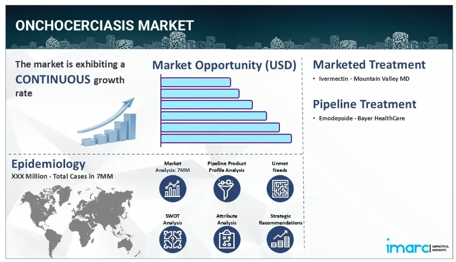 IMARC Groupの新報告書は、米国、EU5(ドイツ、スペイン、イタリア、フランス、英国)、および日本におけるオンコセルカ症市場について包括的な分析を提供します。これには、治療実践、市場流通中および開発中の薬剤、個別療法のシェア、7大市場における市場動向、主要企業とその薬剤の市場実績などが含まれます。本レポートではさらに、7大市場における現在および将来の患者数についても提示しています。