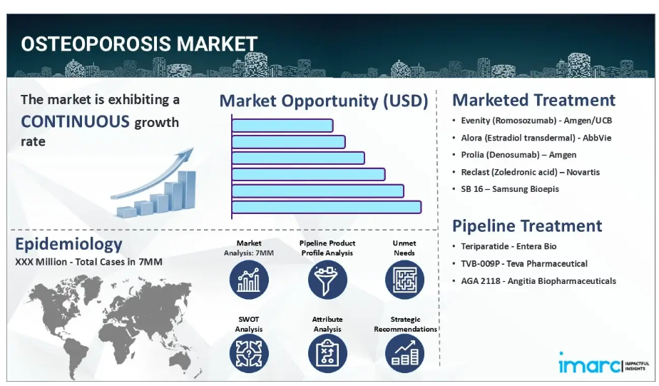 IMARC Groupの新報告書は、米国、EU4(ドイツ、スペイン、イタリア、フランス)、英国、日本における骨粗鬆症市場を包括的に分析しております。これには、治療実践、市場流通薬・開発中の薬剤、個別療法のシェア、主要7市場における市場動向、主要企業とその薬剤の市場実績などが含まれます。また、主要7市場における現在および将来の患者数についても提示しております。本報告書によれば、米国は骨粗鬆症患者数が最も多く、治療市場規模も最大です。さらに、現行の治療実践/アルゴリズム、市場推進要因、課題、機会、償還状況、未充足医療ニーズなども記載されています。本レポートは、製造メーカー、投資家、ビジネス戦略担当者、研究者、コンサルタント、ならびに骨粗鬆症市場に関与している、または参入を計画している全ての方にとって必読の資料です。