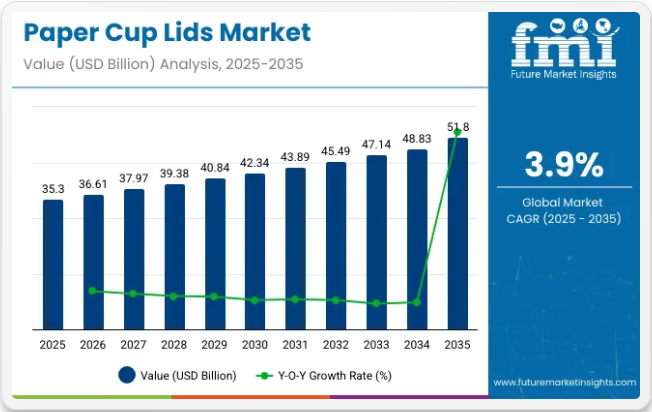 The global paper cup lids market is estimated to reach USD 35.3 billion in 2025 and is projected to grow at a compound annual growth rate (CAGR) of 3.9% through 2035, reaching an estimated value of USD 51.8 billion. This growth is primarily driven by the increasing demand for eco-friendly packaging solutions and the growing consumption of beverages worldwide.