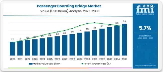 世界の旅客搭乗橋市場は、2025年から2035年の間に安定した成長過程を遂げ、年平均成長率(CAGR)5.7%で拡大すると予想されています。2025年の市場規模は22億1,000万米ドルと推定され、2035年までに38億4,000万米ドルに達すると予測されている。