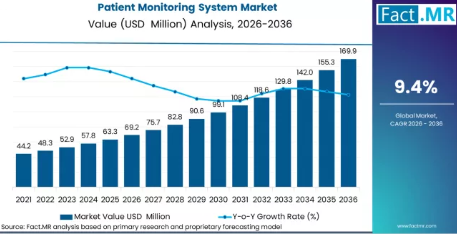 2025年、患者モニタリングシステム市場は6,260万米ドルと評価されました。Fact.MRの分析によると、患者モニタリングシステムへの需要は、2026年には6,920万米ドル、2036年までに1億6,990万米ドルに達すると推定されており、予測期間中の年平均成長率(CAGR)は9.4%となる見込みです。市場の拡大は、慢性疾患および急性疾患による入院患者数の増加、集中治療における多項目モニタリングの導入拡大、および在宅モニタリングソリューションの普及拡大を反映しています。