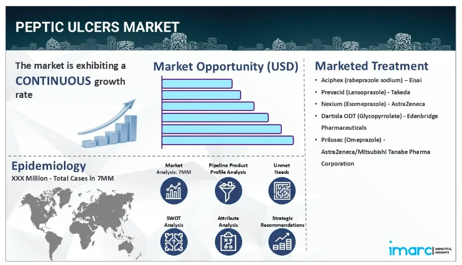 IMARC Groupの新報告書は、米国、EU4(ドイツ、スペイン、イタリア、フランス)、英国、日本における消化性潰瘍市場を包括的に分析しております。これには治療実践、市場流通中および開発中の薬剤、個別療法のシェア、主要7市場における市場動向、主要企業とその薬剤の市場実績などが含まれます。また、主要7市場における現在および将来の患者層についても提示しております。本報告書によれば、米国は消化性潰瘍の患者数が最も多く、治療市場としても最大規模を占めています。さらに、現行の治療実践/アルゴリズム、市場推進要因、課題、機会、償還状況、未充足医療ニーズなども本報告書で提供されています。本レポートは、製造業者、投資家、ビジネス戦略家、研究者、コンサルタント、ならびに消化性潰瘍市場に関与している、または参入を計画している全ての方にとって必読の資料です。