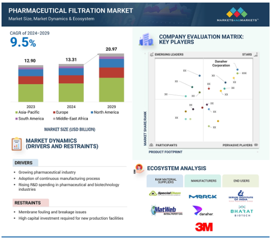 医薬品ろ過の市場は、2024年の133億1,000万米ドルから2029年には209億7,000万米ドルに達すると予測され、2024年から2029年までの年平均成長率は9.5%です。市場成長の要因は、生物製剤やバイオ医薬品の生産量の増加、シングルユース技術の採用拡大、製薬・バイオ産業における研究開発費の増加などです。無菌ろ過は、生物製剤とワクチン製造の開発への注目が高まっているため、市場で大きなシェアを占めています。