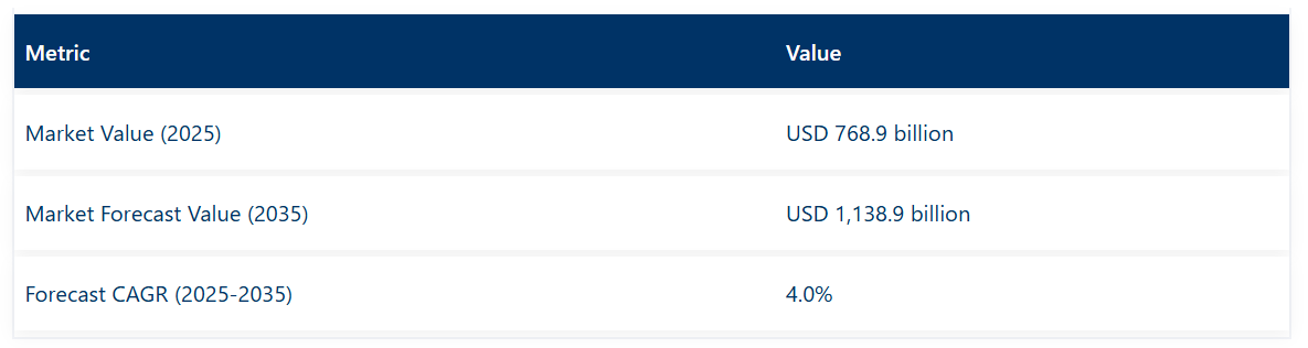 世界のプラスチック市場は、2035年までに1兆1,389億米ドルに達すると予測されており、予測期間中に3,700億米ドルの絶対的な増加を記録する見込みです。2025年の市場規模は7,689億米ドルと評価されており、評価期間中に年平均成長率(CAGR)4.0%で上昇する見通しです。