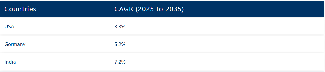 以下の表は主要3地域の収益予測成長率を示す。米国、ドイツ、インドは高消費地域に分類され、2035年までにそれぞれ3.3%、5.2%、7.2%のCAGRを記録する見込み。