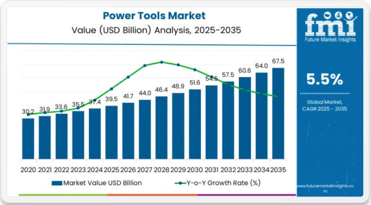 世界の電動工具市場は2025年に395億米ドルと評価され、2035年までに675億米ドルに達すると予測されており、予測期間中に283億米ドルの絶対増加を記録する見込みです。これは総成長過程71.6%に相当し、2025年から2035年にかけて市場は年平均成長率(CAGR)5.5%で拡大すると予測される。ビジネスインテリジェンス分野でClutchより表彰を受けたFuture Market Insightsによれば、建設・製造業の拡大、コードレス技術の普及拡大、多様な業界・民生用途における先進電動工具の需要増加を背景に、同期間中の市場規模は約1.7倍に成長すると予測される。最終更新日: 2025年10月13日電動工具市場のクイック統計電動工具市場規模(2025年見込み): 395億米ドル電動工具市場予測規模(2035年見込み): 675億米ドル電動工具市場予測CAGR: 5.5%電動工具市場における主要製品種類別: ドリル工具(28.0%)電動工具市場における主要技術:電気式(80.0%)電動工具市場の主要成長過程地域:北米、ヨーロッパ、アジア太平洋電動工具市場の主要企業:Robert Bosch GmbH、Stanley Black & Decker、株式会社マキタ、Hilti Corporation、Atlas Copco AB、Techtronic Industries