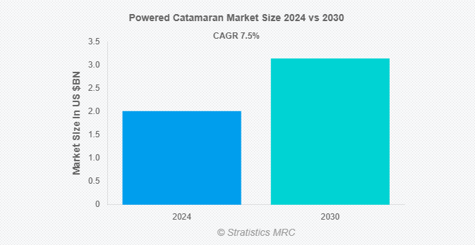 Stratistics MRCによると、世界の動力双胴船市場は2024年に20億1,000万ドルを占め、予測期間中の年平均成長率は7.5%で、2030年には31億4,000万ドルに達する見込みです。パワードカタマランは、風力に頼るのではなく、エンジンやモーターで駆動する2つの平行な船体を持つボートや船舶の一種です。この設計は、従来の単一船体(モノハル)ボートと比較して、より高い安定性、スピード、燃料効率を提供します。船幅が広いためデッキスペースが広く、乗客や貨物を運ぶのに最適で、荒れた海でもスムーズで快適な乗り心地を提供します。
