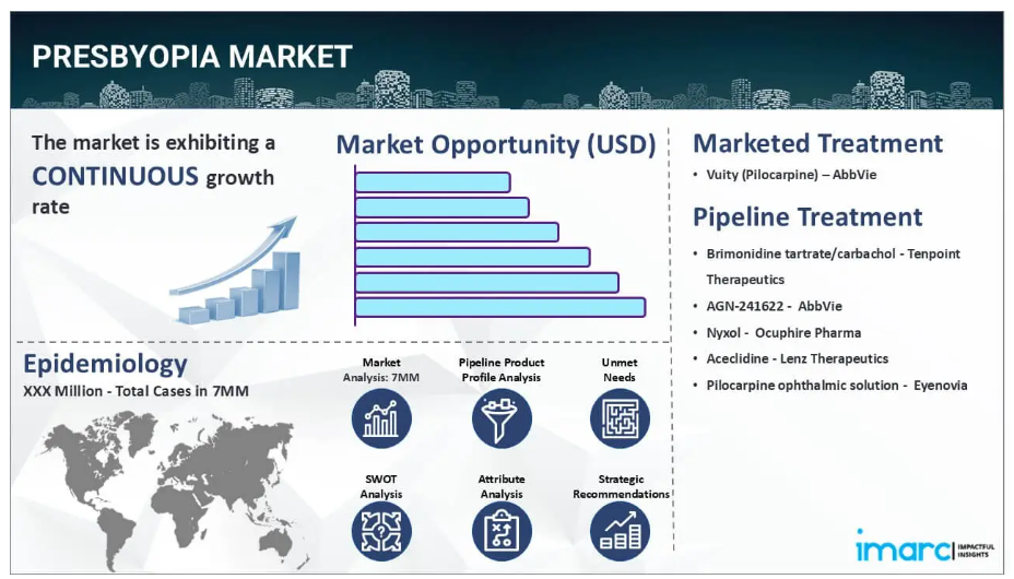 IMARC Groupの新報告書は、米国、EU4(ドイツ、スペイン、イタリア、フランス)、英国、日本における老眼市場の詳細な分析を提供します。これには、治療実践、市場流通中および開発中の薬剤、個別療法のシェア、7大市場における市場動向、主要企業とその薬剤の市場実績などが含まれます。本レポートでは、7大市場における現在および将来の患者層についても提示しております。レポートによれば、米国は老眼患者数が最も多く、その治療市場も最大規模を占めております。さらに、現在の治療実践/アルゴリズム、市場推進要因、課題、機会、償還シナリオ、未充足医療ニーズなども本報告書で提供されています。本報告書は、メーカー、投資家、ビジネス戦略家、研究者、コンサルタント、および老眼市場に関与している、あるいは参入を計画している全ての方にとって必読の資料です。