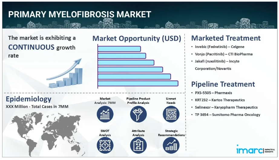 血液細胞産生調節に関わるシグナル伝達ネットワークに影響を与え、異常な細胞増殖を引き起こす遺伝子変異の症例増加が、原発性骨髄線維症市場の主な推進要因となっております。これに加え、線維化や健康な組織の破壊に寄与する可能性のある慢性炎症や免疫調節異常の発生率上昇も、市場にとって前向きな見通しを生み出しています。さらに、症状の軽減、脾臓肥大の抑制、患者の生活の質の向上など、数多くの利点があることから、ヤヌスキナーゼ(JAK)阻害剤などの標的療法が広く採用されていることも、市場の成長をさらに後押ししています。これとは別に、骨髄内の線維性組織形成の原因となる異常な幹細胞クローンを根絶することを目的とした幹細胞移植の応用拡大も、もう一つの重要な成長促進要因として作用しています。さらに、サリドマイドやレナリドマイドを含む免疫調節薬の普及が進んでおります。これらは特定のサイトカインの放出を調節することで免疫バランスを回復させるため、予測期間中に原発性骨髄線維症市場を牽引すると見込まれております。