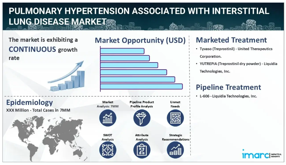 IMARC Groupの新報告書は、米国、EU4(ドイツ、スペイン、イタリア、フランス)、英国、日本における間質性肺疾患に伴う肺高血圧症市場について、包括的な分析を提供しております。これには、治療実践、市場流通中および開発中の薬剤、個別療法のシェア、主要7市場における市場動向、主要企業とその薬剤の市場実績などが含まれます。本レポートでは、7つの主要市場における現在および将来の患者数についても提示しております。