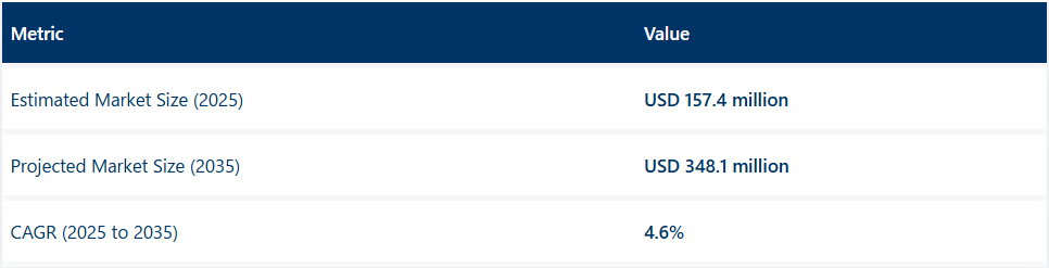 世界の急速注入器市場:急速注入器市場は、2025年の1億5740万米ドルから2035年までに3億4810万米ドルへ成長し、年平均成長率(CAGR)4.6%で拡大すると予測