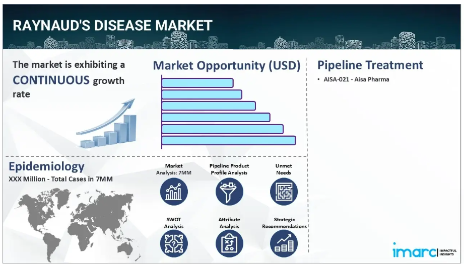 IMARC Groupの新報告書は、米国、EU4(ドイツ、スペイン、イタリア、フランス)、英国、日本におけるレイノー病市場について包括的な分析を提供しております。これには、治療実践、市場流通中および開発中の薬剤、個別療法のシェア、主要7市場における市場動向、主要企業とその薬剤の市場実績などが含まれます。また、主要7市場における現在および将来の患者数についても記載されております。本報告書によれば、米国はレイノー病の患者数が最も多く、治療市場としても最大規模を占めています。さらに、現在の治療実践/アルゴリズム、市場推進要因、課題、機会、償還シナリオ、未充足医療ニーズなども本報告書に記載されております。本報告書は、メーカー、投資家、ビジネス戦略家、研究者、コンサルタント、ならびにレイノー病市場に関与している、または参入を計画している全ての方にとって必読の資料です。