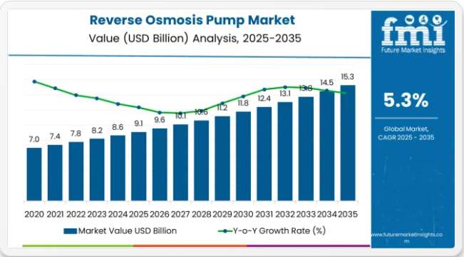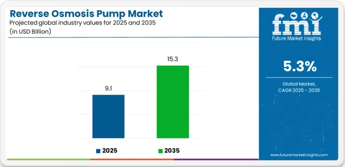 世界の逆浸透ポンプ市場は、2025年に91億米ドルと評価され、2035年までに153億米ドルに達すると予測されており、予測期間中に62億米ドルの絶対的な増加を示しています。これは総成長過程68.1%に相当し、2025年から2035年にかけて市場は年平均成長率(CAGR)5.3%で拡大すると予測される。意思決定レベルの分析で知られるFuture Market Insightsによれば、水不足への懸念の高まり、海水淡水化への投資拡大、様々な業界・自治体向け水処理用途における効率的な浄水技術の採用増加に支えられ、同期間中に市場規模全体は約1.7倍に成長すると予想される。