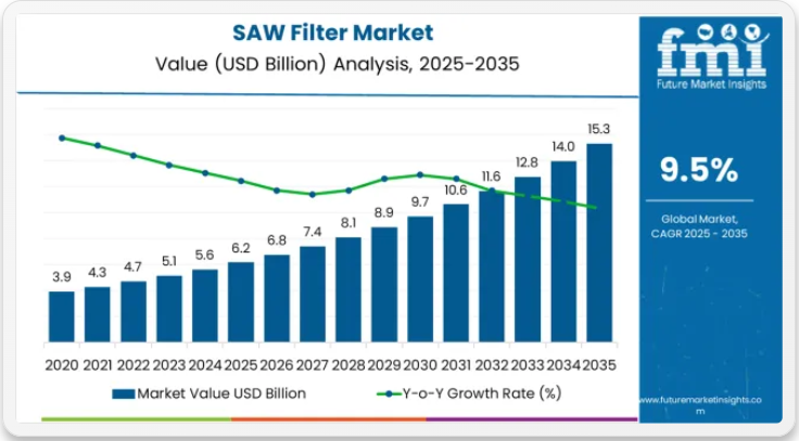 SAWフィルタ市場は、2025年の62億米ドルから2035年までに152億3000万米ドルへ成長し、大幅な成長過程にある。これは、通信インフラ、民生用電子機器、自動車分野における先進フィルタリング技術と周波数管理最適化の採用が加速していることを示している。