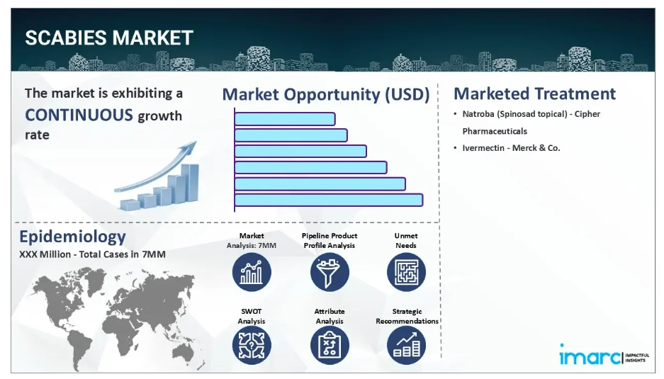 IMARC社の新報告書「疥癬(かいせん)市場規模、疫学、市場内医薬品売上高、開発中の治療法、および地域別見通し 2025-2035年」において、疥癬市場が包括的に分析されました。疥癬は、疥癬虫(Sarcoptes scabiei)による感染性の皮膚寄生虫症であり、この寄生虫が皮膚に潜り込むことで激しいかゆみと発疹を引き起こします。この寄生虫感染症は、長時間の皮膚接触を通じて伝播し、あらゆる年齢層の人々に感染する可能性があり、人口密集地域や機関内での発生率が高くなります。