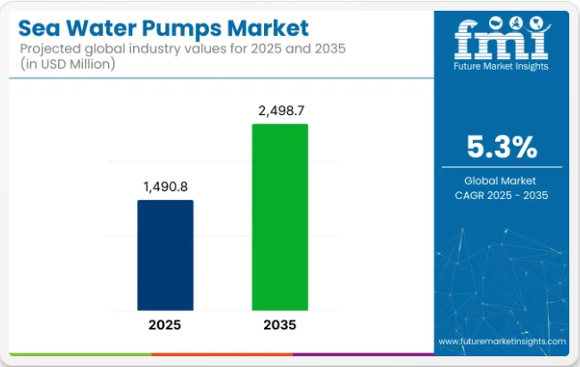 世界の海水ポンプ市場は、2025年に14億9,080万米ドルと推定され、2035年までに24億9,870万米ドルに達すると予測されており、予測期間中のCAGRは5.3%となる見込みです。この市場の成長過程は、海洋環境における業界活動の拡大、特に海水淡水化、船舶用熱システム、および海洋作業によって牽引されています。