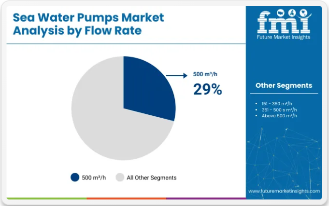 流量500m³/h超の海水ポンプは、2025年に世界の市場の29%を占め、2035年まで年平均成長率(CAGR)5.5%で成長すると予測される。これらの大容量ポンプは、熱式海水淡水化装置、海洋プラットフォーム、沿岸産業施設の冷却システムなど大規模用途で広く採用された。