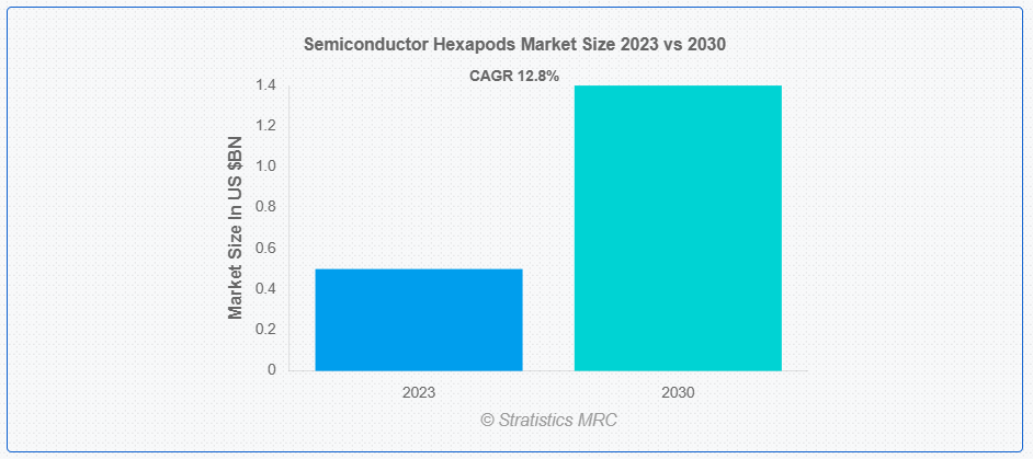 ストラティスティクスMRCによると、世界の半導体ヘキサポッド市場は2023年に5億ドル規模であり、予測期間中に年平均成長率(CAGR)12.8%で成長し、2030年までに14億ドルに達すると見込まれている。半導体ヘキサポッドは、半導体製造工程で必要とされる微細かつ精密な動作に特化した高度なロボットシステムである。これらのヘキサポッド(スチュワートプラットフォームとも呼ばれる)の6本の伸縮式脚部は、卓越した動作制御と位置精度を実現する。さらに、半導体業界では精密さと微細化が重要であるため、ヘキサポッドはウェーハの取り扱い、位置合わせ、検査などの作業に不可欠である。物体を操作する微細な精度が求められる用途では、従来のロボットシステムでは不十分な場合があり、ヘキサポッドが必須となる。
