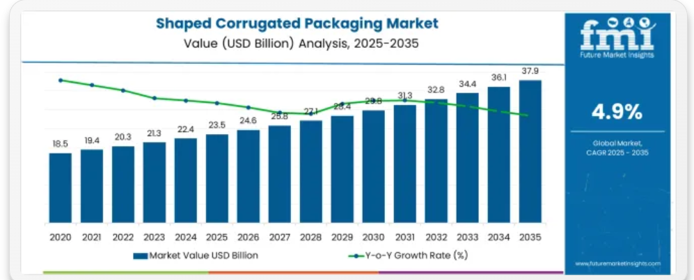 成形段ボール包装の市場規模は、2025年に235億米ドルと推定され、2035年には379億米ドルに達し、予測期間中の年平均成長率(CAGR)は4.9%になると予測されています。