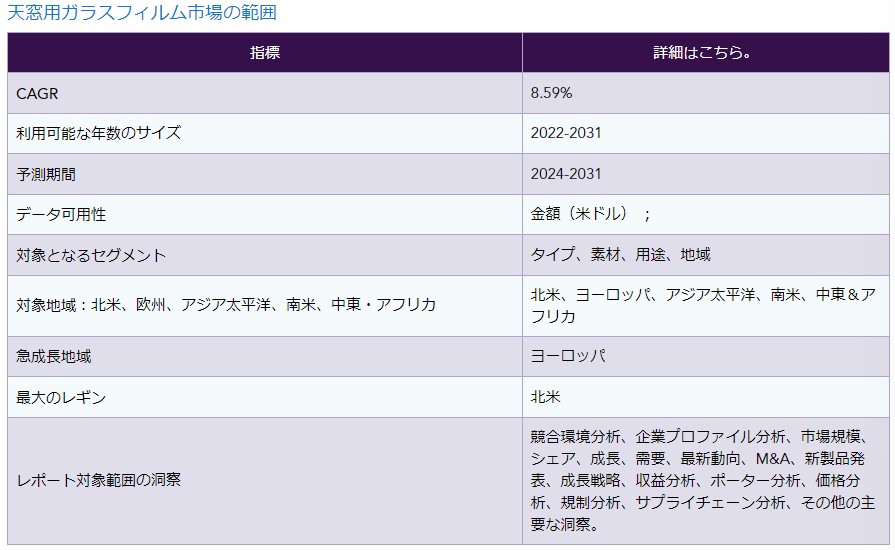 世界の天窓用ガラスフィルム市場をタイプ、素材、用途、地域別に可視化し、主要な商業資産やプレイヤーを理解する。