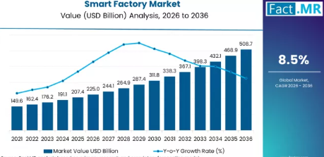 2025年、スマートファクトリー市場の規模は2,074億米ドルと評価されました。Fact.MRの分析によると、スマートファクトリーソリューションへの需要は、2026年には2,250億米ドル、2036年までに5,087億米ドルへと拡大すると推定されています。Fact.MRは、予測期間中の年平均成長率(CAGR)を8.5%と予測しています。