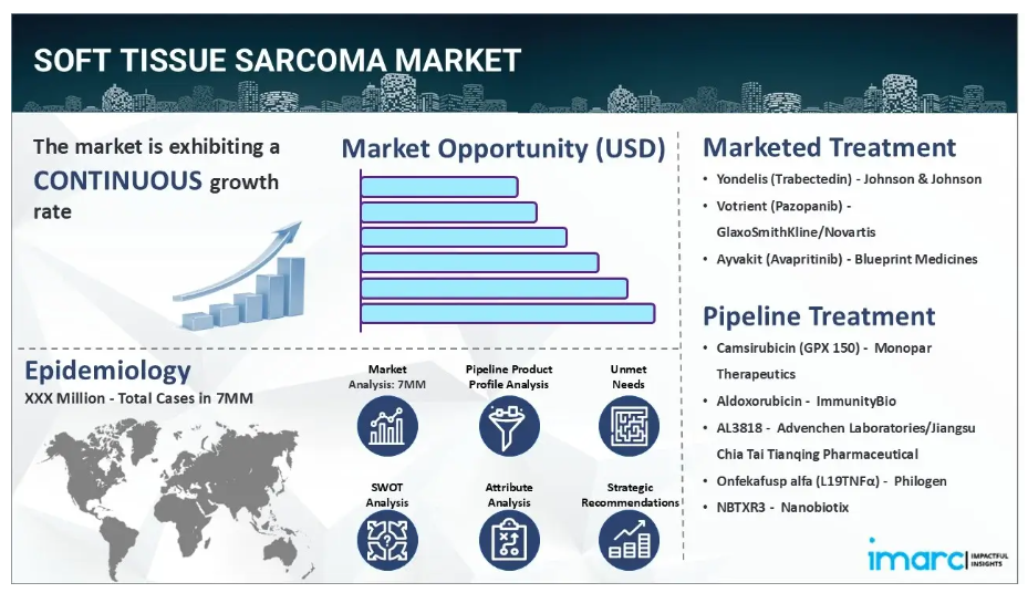 IMARC Groupの新報告書は、米国、EU4(ドイツ、スペイン、イタリア、フランス)、英国、日本における軟部肉腫市場について包括的な分析を提供しております。これには、治療実践、市場流通中および開発中の薬剤、個別療法のシェア、主要7市場における市場動向、主要企業とその薬剤の市場実績などが含まれます。また、主要7市場における現在および将来の患者数についても提示しております。本報告書によれば、米国は軟部肉腫の患者数が最も多く、治療市場としても最大規模を占めています。さらに、現在の治療実践/アルゴリズム、市場推進要因、課題、機会、償還状況、未充足医療ニーズなども本報告書で提供されています。本レポートは、製造業者、投資家、ビジネス戦略担当者、研究者、コンサルタント、ならびに軟部組織肉腫市場に関与している、または参入を計画している全ての関係者にとって必読の資料です。