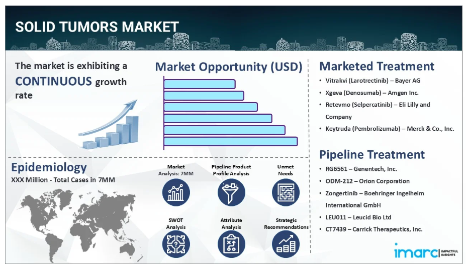 IMARC Groupの新報告書は、米国、EU4(ドイツ、スペイン、イタリア、フランス)、英国、日本における固形腫瘍市場について包括的な分析を提供します。これには、治療実践、市場流通中および開発中の薬剤、個別療法のシェア、7大市場における市場動向、主要企業とその薬剤の市場実績などが含まれます。本報告書では、7大市場における現在および将来の患者数についても提示しています。本報告書によれば、米国は固形腫瘍の患者数が最も多く、治療市場としても最大規模を占めています。さらに、現行の治療実践/アルゴリズム、市場推進要因、課題、機会、償還状況、未充足医療ニーズなども本報告書で提供されています。本レポートは、製造業者、投資家、ビジネス戦略家、研究者、コンサルタント、ならびに固形腫瘍市場に関与している、または参入を計画している全ての方にとって必読の資料です。